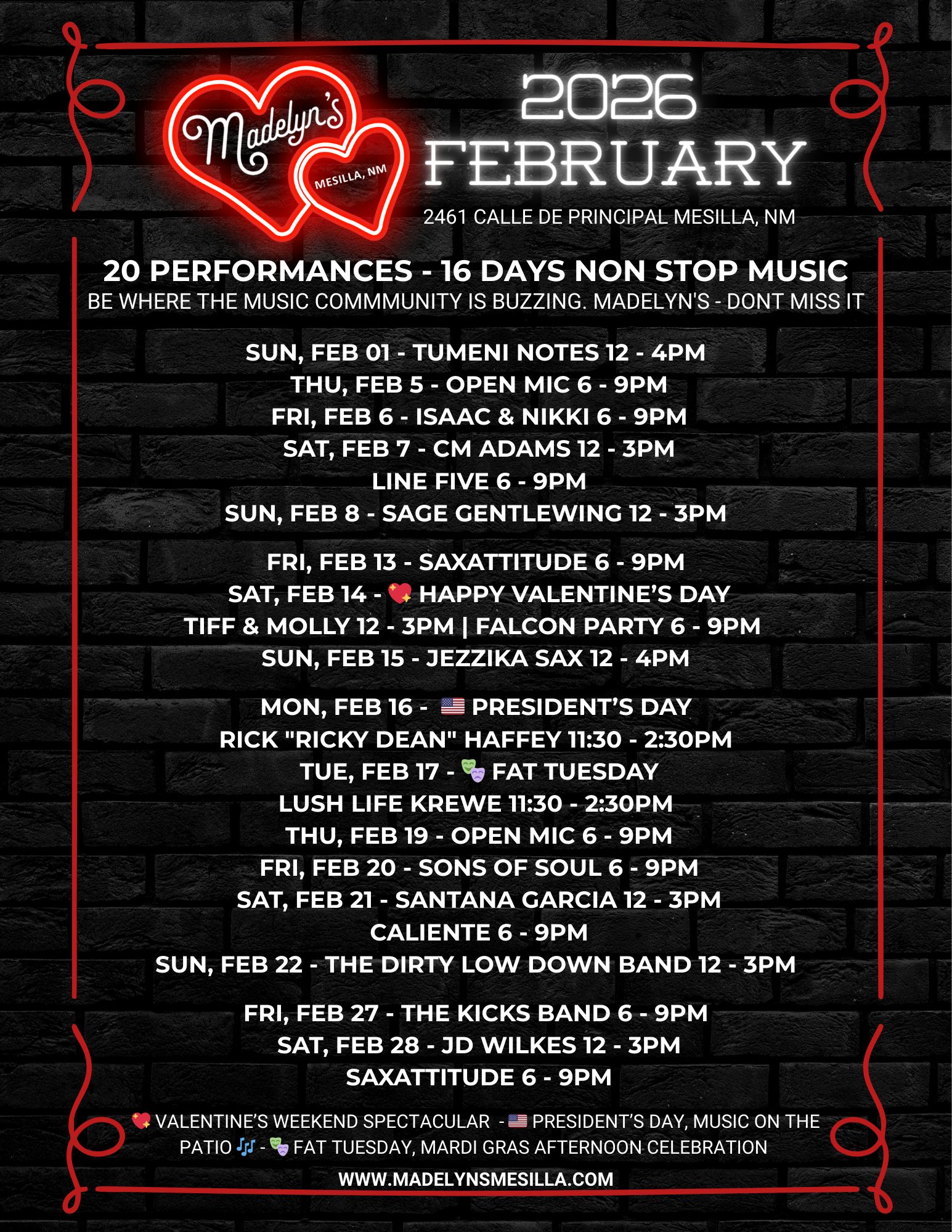 February is packed with great music and fun at Madelyn’s in Mesilla!