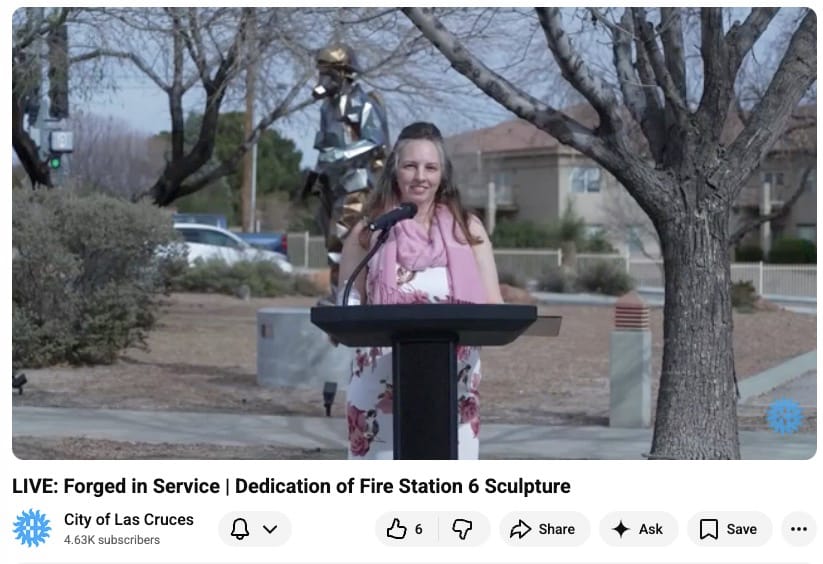 The City of Las Cruces held a Ribbon Cutting for the new Forged in Fire Public Art Work at Las Cruces Fire Station #6 at Northrise & Roadrunner recently and here is a video of that dedication. The artwork was created by Trevor O’Tool a Tucson based metal artist. Public art projects at Fire Station #1 and Fire Station #9 are currently under construction.